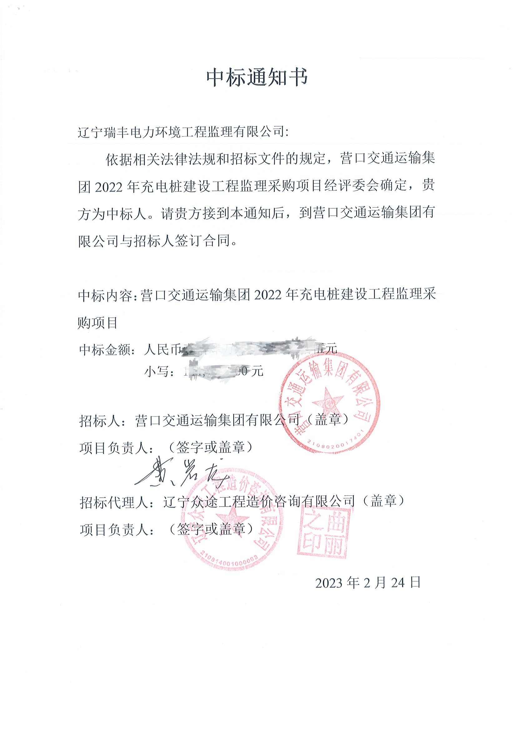 中標(biāo)喜訊-營(yíng)口交通運(yùn)輸集團(tuán)2022年充電樁建設(shè)工程監(jiān)理采購(gòu)項(xiàng)目
