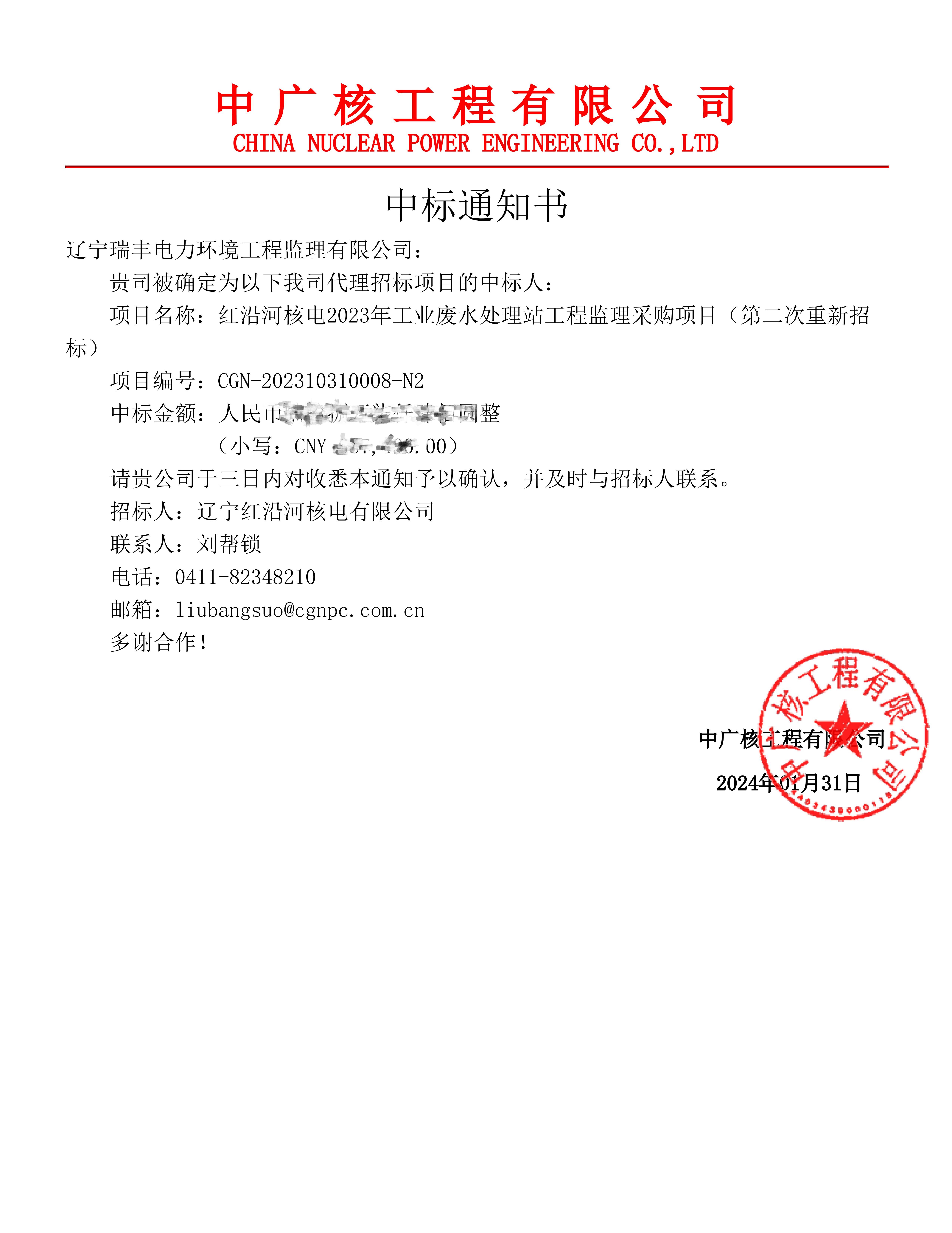 中標(biāo)喜訊-紅沿河核電2023年工業(yè)廢水處理站工程監(jiān)理采購項目