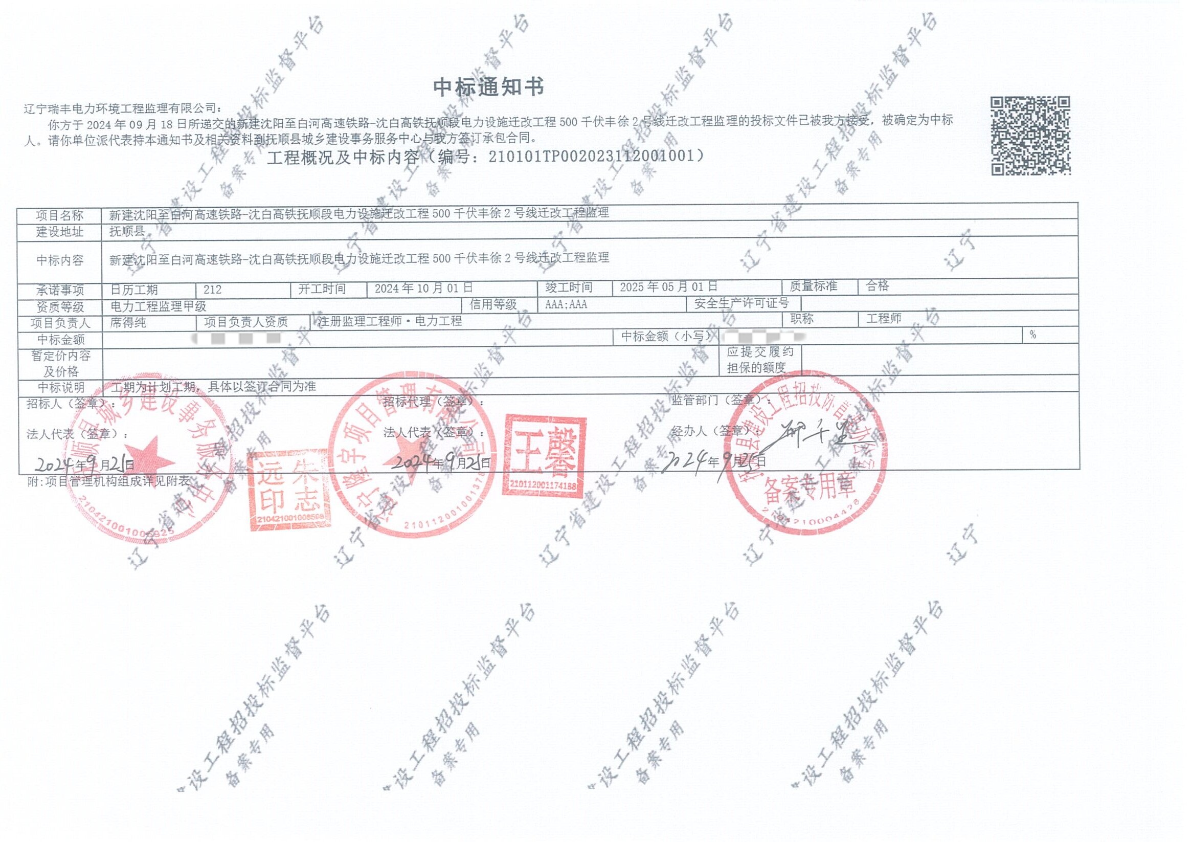 中標喜訊-新建沈陽至白河高速鐵路-沈白高鐵撫順段電力設(shè)施遷改工程 500 千伏豐徐2號線遷改工程監(jiān)理