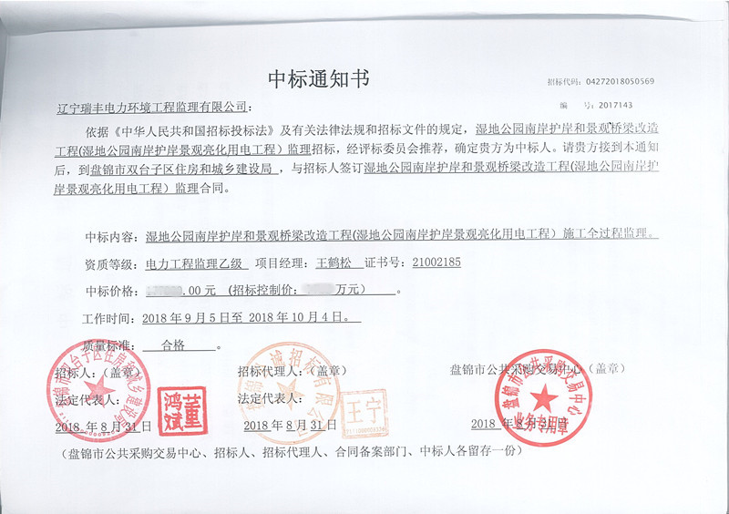 中標(biāo)喜訊-濕地公園南岸、護(hù)岸和景觀橋梁改造工程(濕地公園南岸護(hù)岸景觀亮化用電工程)監(jiān)理