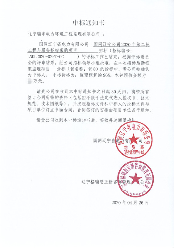 中標(biāo)喜訊-國(guó)網(wǎng)遼寧公司2020年第二批工程與服務(wù)招標(biāo)采購(gòu)項(xiàng)目